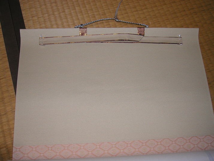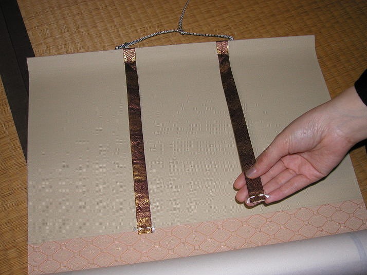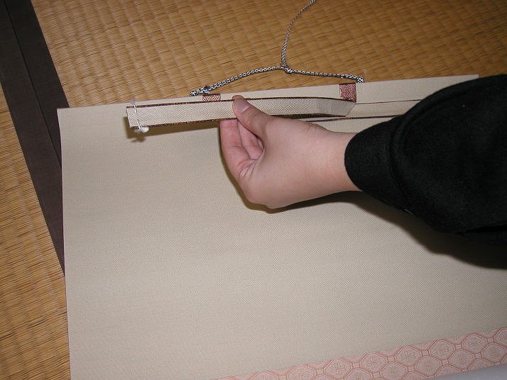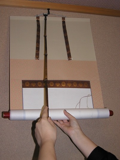 | 写真B掛け方 | Bやはずを吊り紐に引っ掛け、掛け軸を少し開いた状態で持ち吊り金具に紐を掛け金具に吊り紐が掛かったらゆっくりと掛け軸を広げます。ここまでが掛け方です。 |