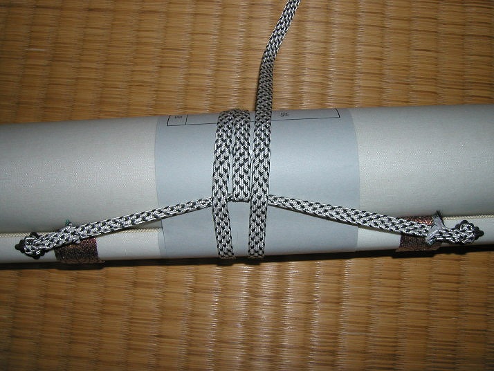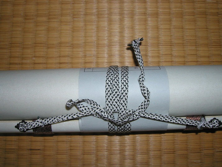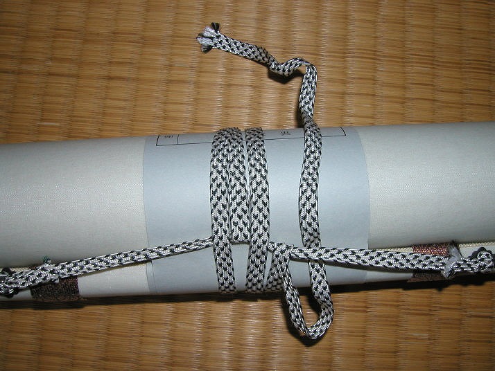 | 写真Fひもの結び方 | Fまずは巻き紙を巻きます。次に巻き紐を二周巻き、余った分を吊り紐部分に引っ掛けます。桐箱に 収納する時は吊り紐が付いてる方を桐箱の枕木の巾が広い方と合わせていれます。 |